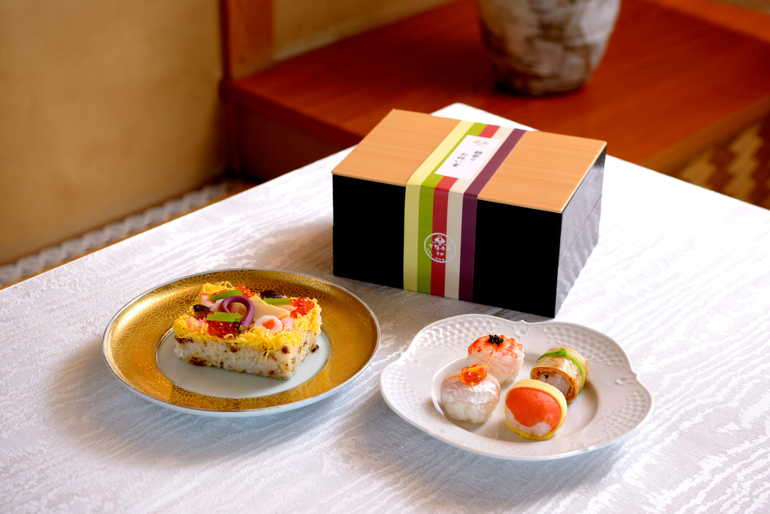 特製ちらし寿司とともに、ゆばや鯛を使った彩り豊かなあんかけ料理、出汁の旨みが染み込んだ高野豆腐と里芋の炊き合わせなど、料亭ならではの繊細な味わいを詰め合わせました。