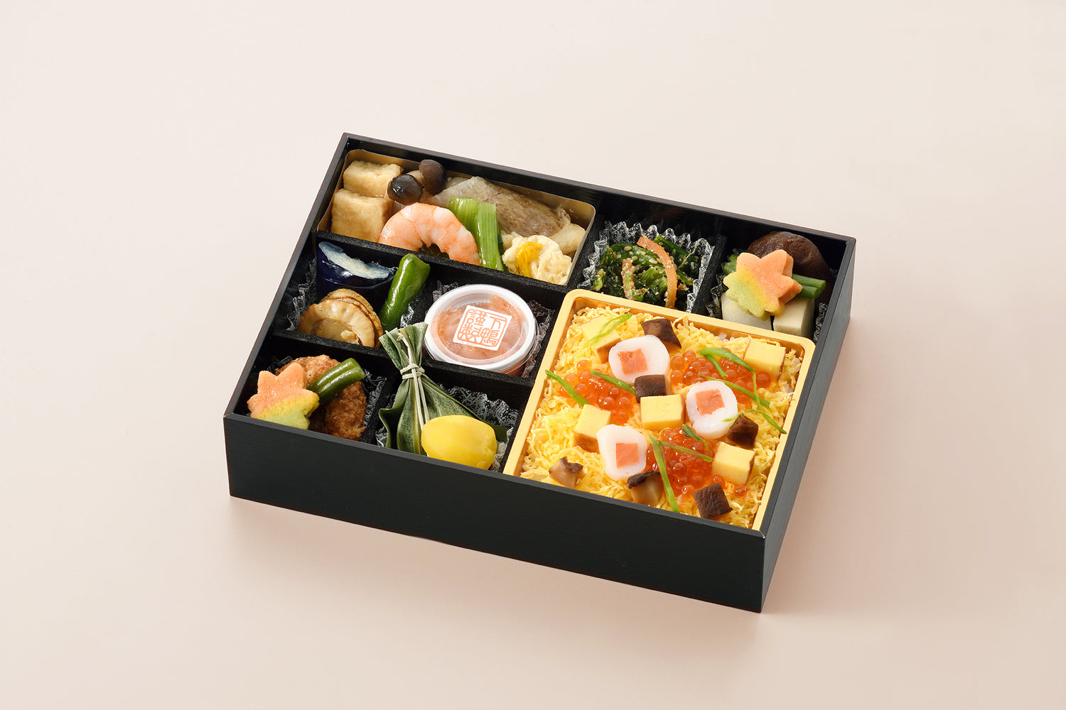 京都祇園の差し入れが発祥ともいわれる手毬寿司と、海老や椎茸煮など山海の幸を贅沢に盛り込んだちらし寿司を詰め合わせた色鮮やかな二段折。