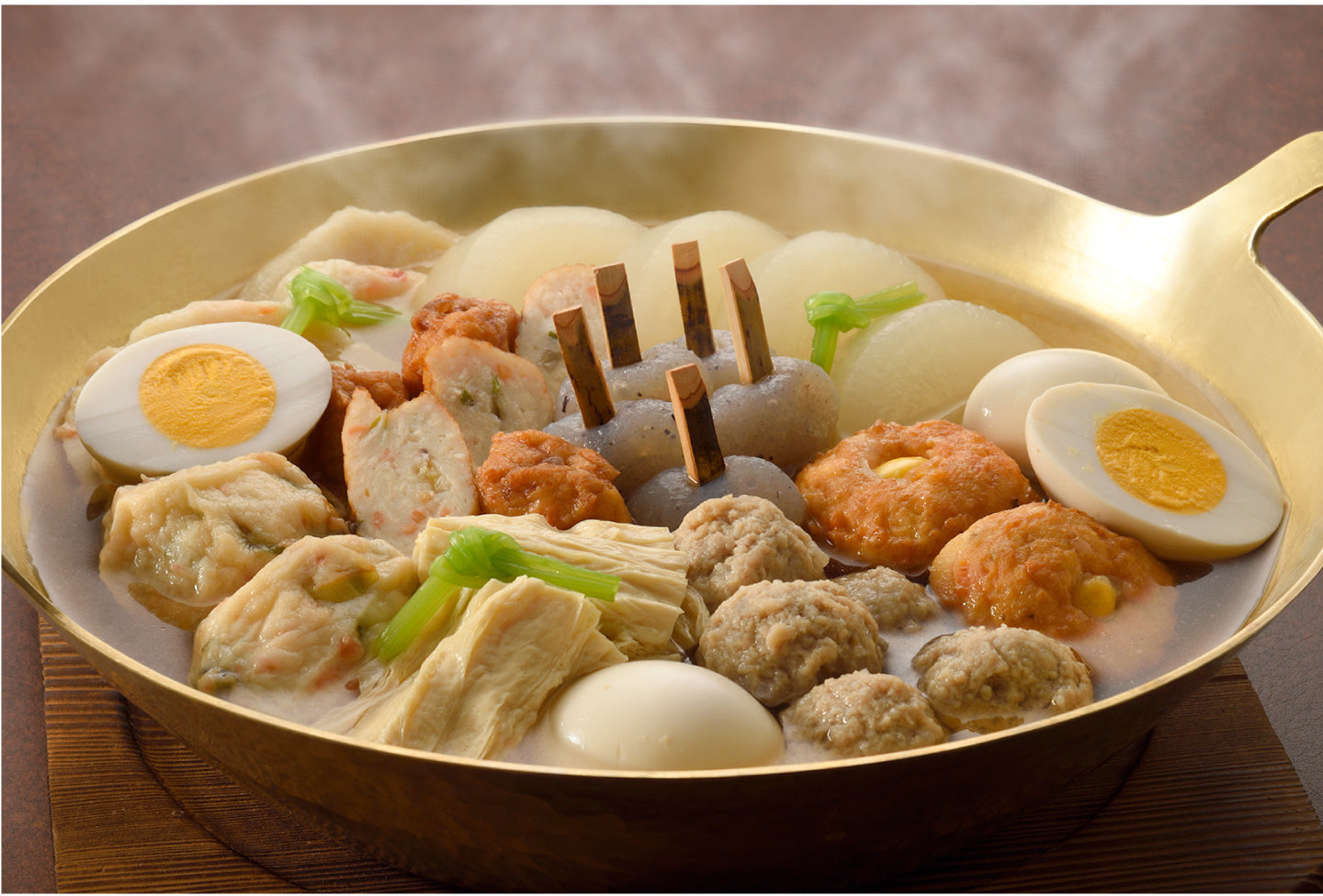 おでんつゆは、白だし・醤油を基本に帆立・鶏を加えた特製の旨み出汁(だし)を使用。