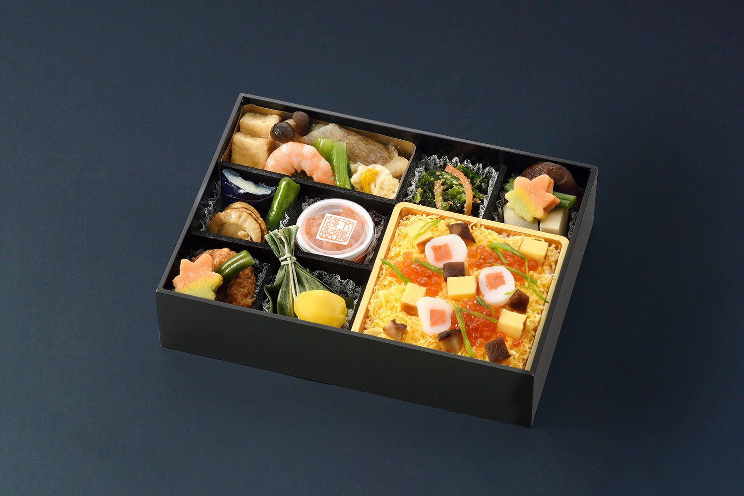 特製ちらし寿司とともに、ゆばや鯛を使った彩り豊かなあんかけ料理、出汁の旨みが染み込んだ高野豆腐と里芋の炊き合わせなど、料亭ならではの繊細な味わいを詰め合わせました。