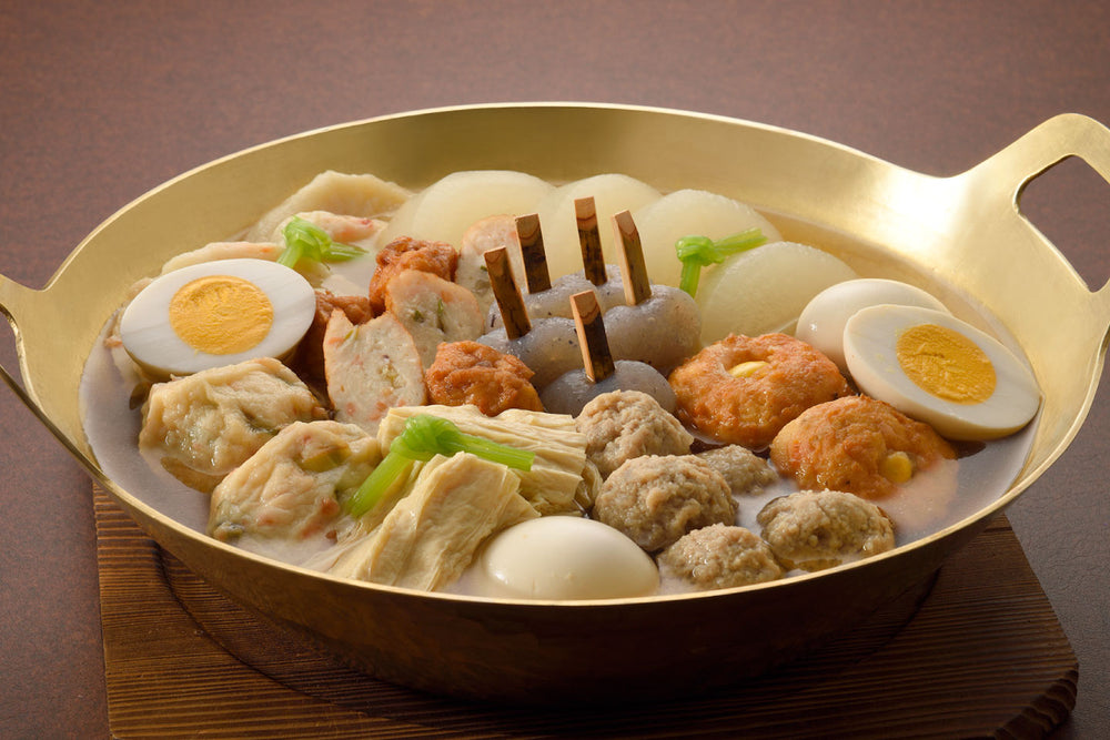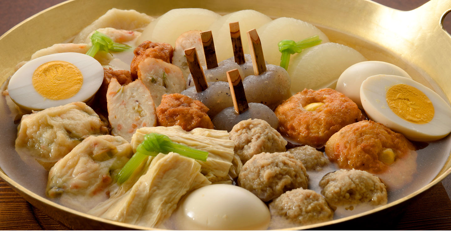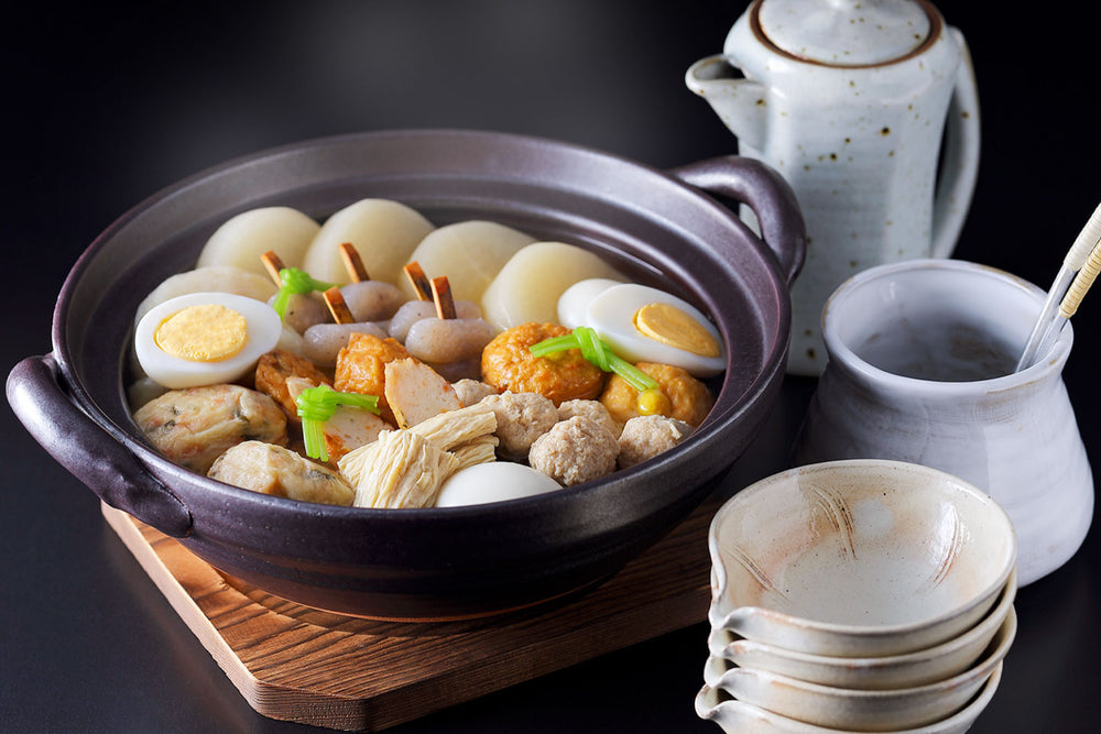 大根や玉子など定番に、生ゆばや京ひろうす、合鴨つくねを加えた9種の具材。繊細で上品な料亭特製出汁で味わう京おでんです。