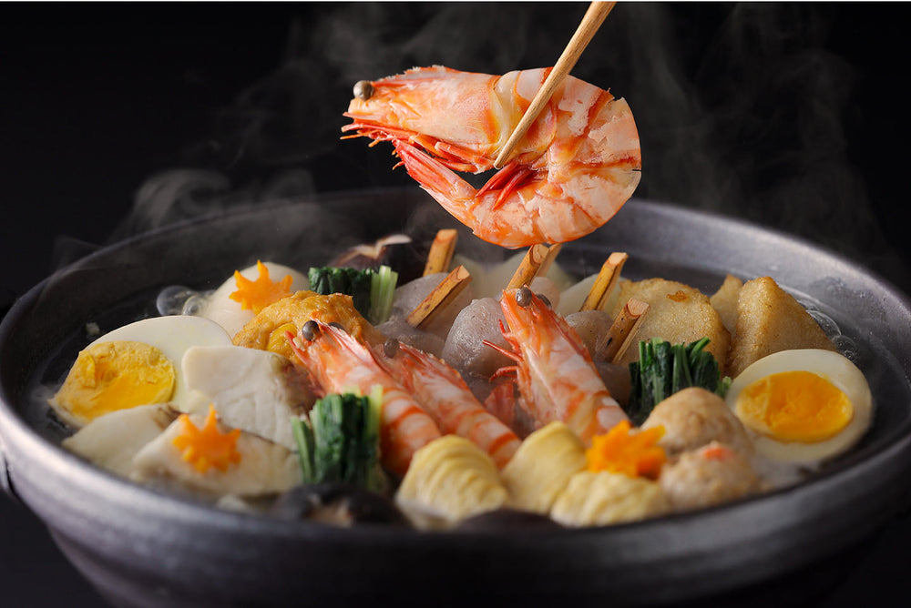 海老や鯛の贅沢海鮮に、大根や玉子、はも天、生ゆばなど京のおでん種を添えました。海鮮出汁が格別に美味しい贅沢な一鍋です。