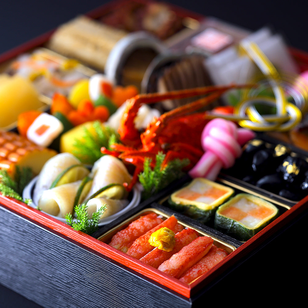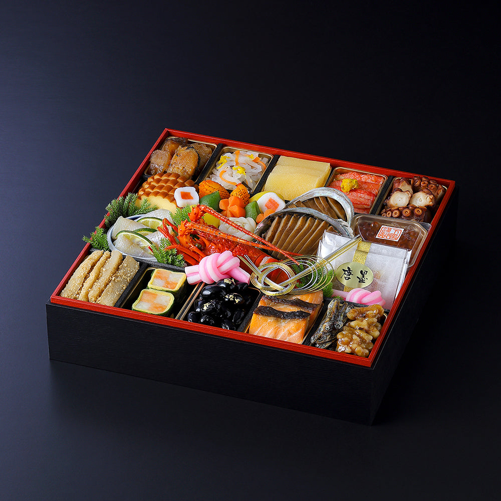 蛸の旨煮、かに甘酢漬、数の子醤油漬、紅白なます、鱈の旨煮、いくら醤油漬、唐墨、千代結び蒲鉾、鮑旨煮、海老塩蒸し、若桃シロップ漬、花百合根甘露煮、梅人参、身巻鮭真丈、松笠烏賊雲丹焼、栗甘露煮、伊達巻、小鯛の香酢漬、くるみ飴煮、田作り、鮭柚庵焼、黒豆甘露煮、市松高菜巻、叩き牛蒡