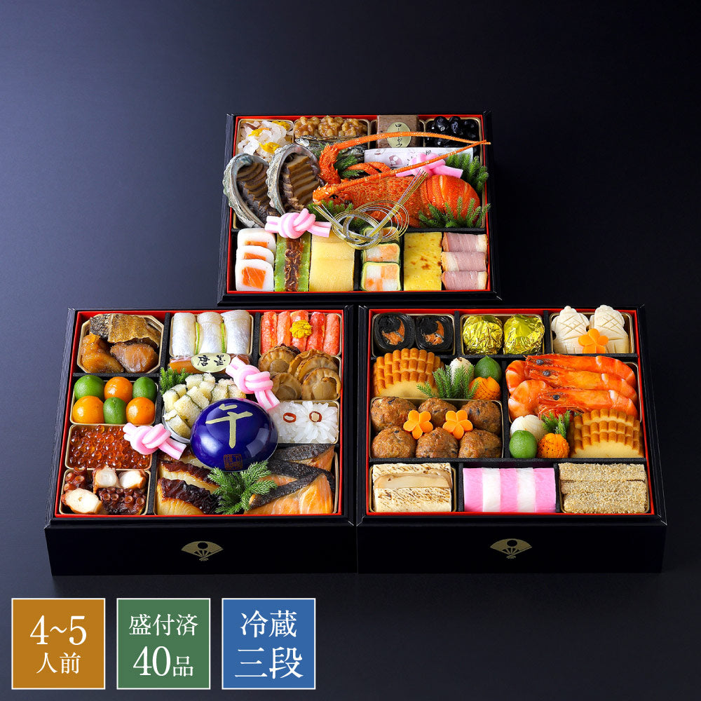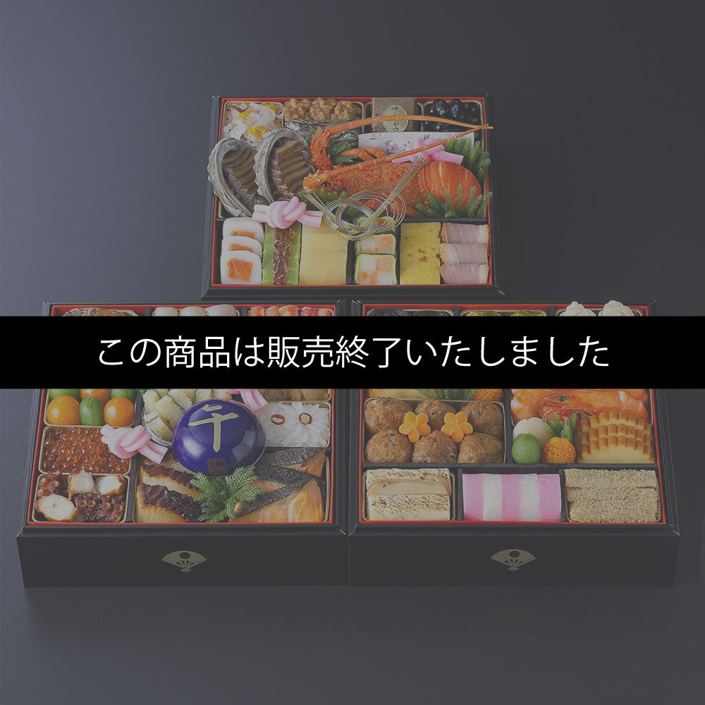 かに甘酢漬、焼帆立、小鯛の香酢漬、唐墨、鱈の旨煮、菊かぶら、子持昆布、金柑蜜煮、若桃シロップ漬、いくら醤油漬、鮭柚庵焼、からす鰈西京焼、蛸の旨煮、千代結び蒲鉾