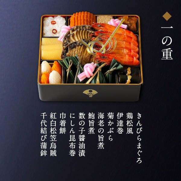 きんぴらまぐろ、鶏松風、伊達巻、菊かぶら、海老の旨煮、鮑旨煮、数の子醤油漬、にしん昆布巻、巾着餅、紅白松笠烏賊、千代結び蒲鉾