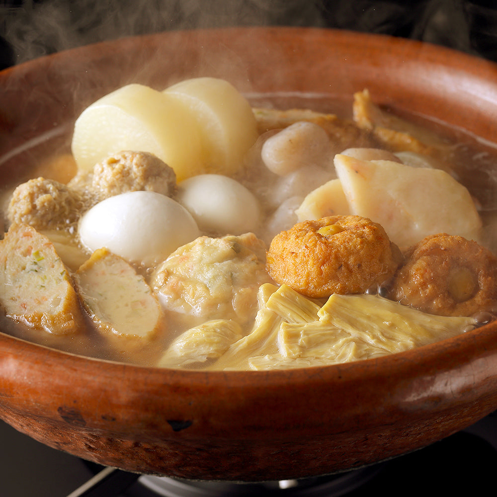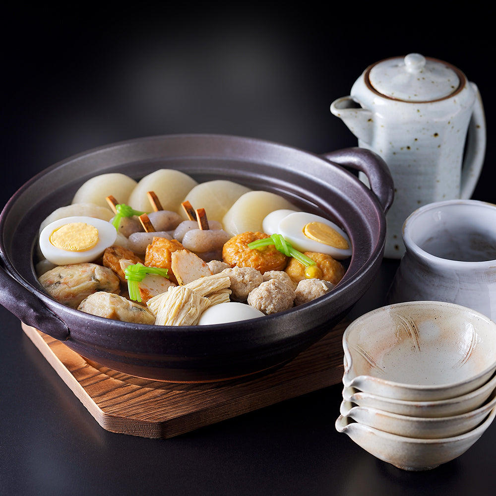 魚肉ねり製品(鶏つくね天、とうふ天、桜えび天)、濃縮おでんつゆ(国内製造)、ゆで大根、ゆで玉子、生ゆば、玉こんにゃく、京ひろうす(豆腐、筍、魚肉、その他)、合鴨つくね/調味料(アミノ酸等)、加工澱粉、酸味料、着色料(紅麹)、保存料(ポリリジン)、水酸化Ca、香料