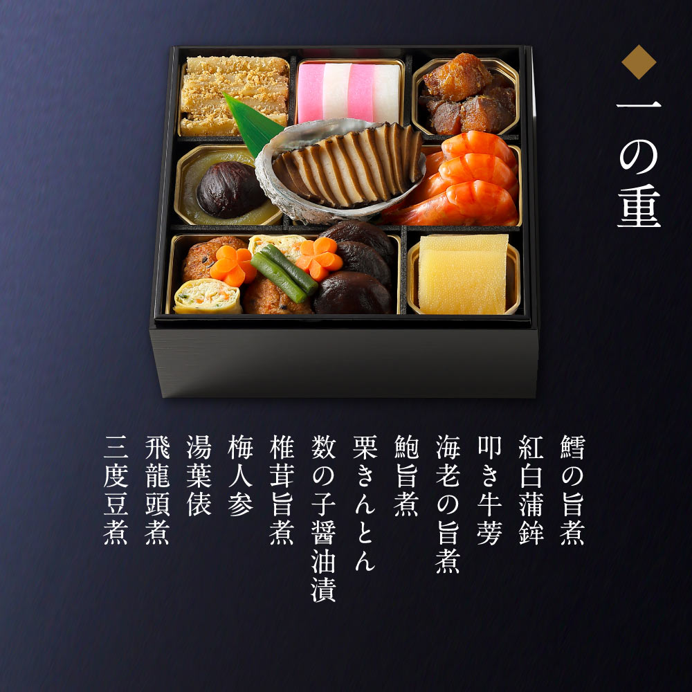 鱈の旨煮、紅白蒲鉾、叩き牛蒡、海老の旨煮、鮑旨煮、栗きんとん、数の子醤油漬、椎茸旨煮、梅人参、湯葉俵、飛龍頭煮、三度豆煮